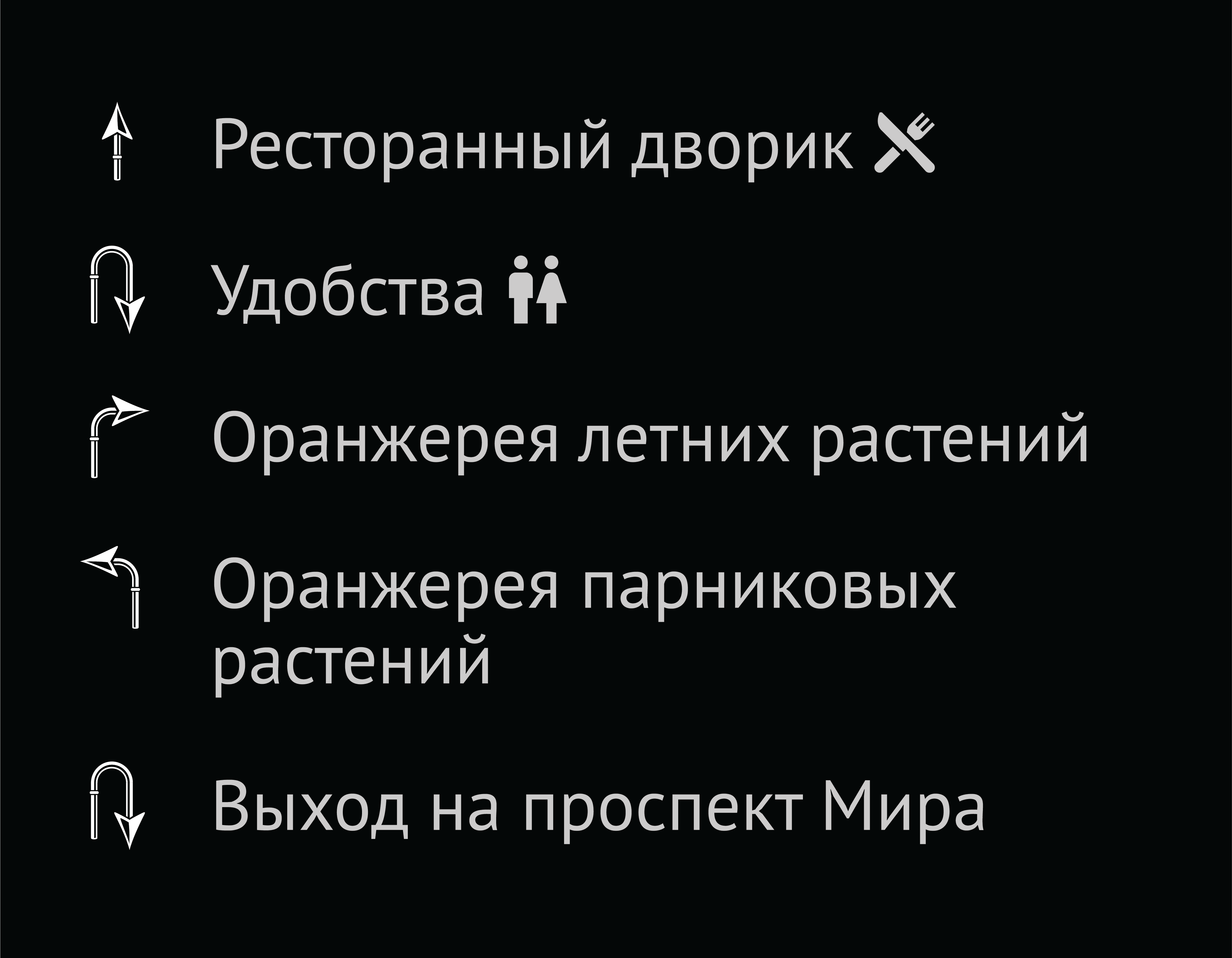 There are some difficult intersections where it is necessary to mark all directions at once. And there is a clear perception that the park's paths are too cozy and narrow, you can't put a pole with signposts in the middle of them. Therefore, it may be necessary to use two signs opposite each other in several places. This would solve the navigation problem without obstructing the view or putting visitors' hats at risk.